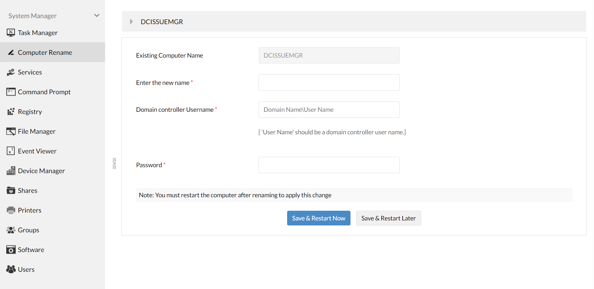 登录您的Remote Access Plus Web控制台,切换到“工具”选项卡,然后选择“系统管理器”。在这里,选择计算机重命名并输入计算机的新名称。随后,如果您使用的是基于Active Directory域的设置,则需要以下图所示的格式输入域管理员帐户(域控制器的管理员凭据)的凭据。否则,对于基于工作组的设置,您只需输入目标计算机的新名称。完成后,您应该重新启动目标计算机以查看更改。