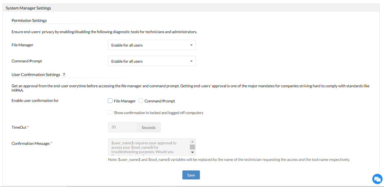 您不必建立远程连接即可开始故障排除!只需直接从控制台访问系统管理器、任务管理器、命令提示符、注册表并传输文件。即使计算机不受监督,也要禁用用户确认,以便随时随地完全访问这些故障排除工具。