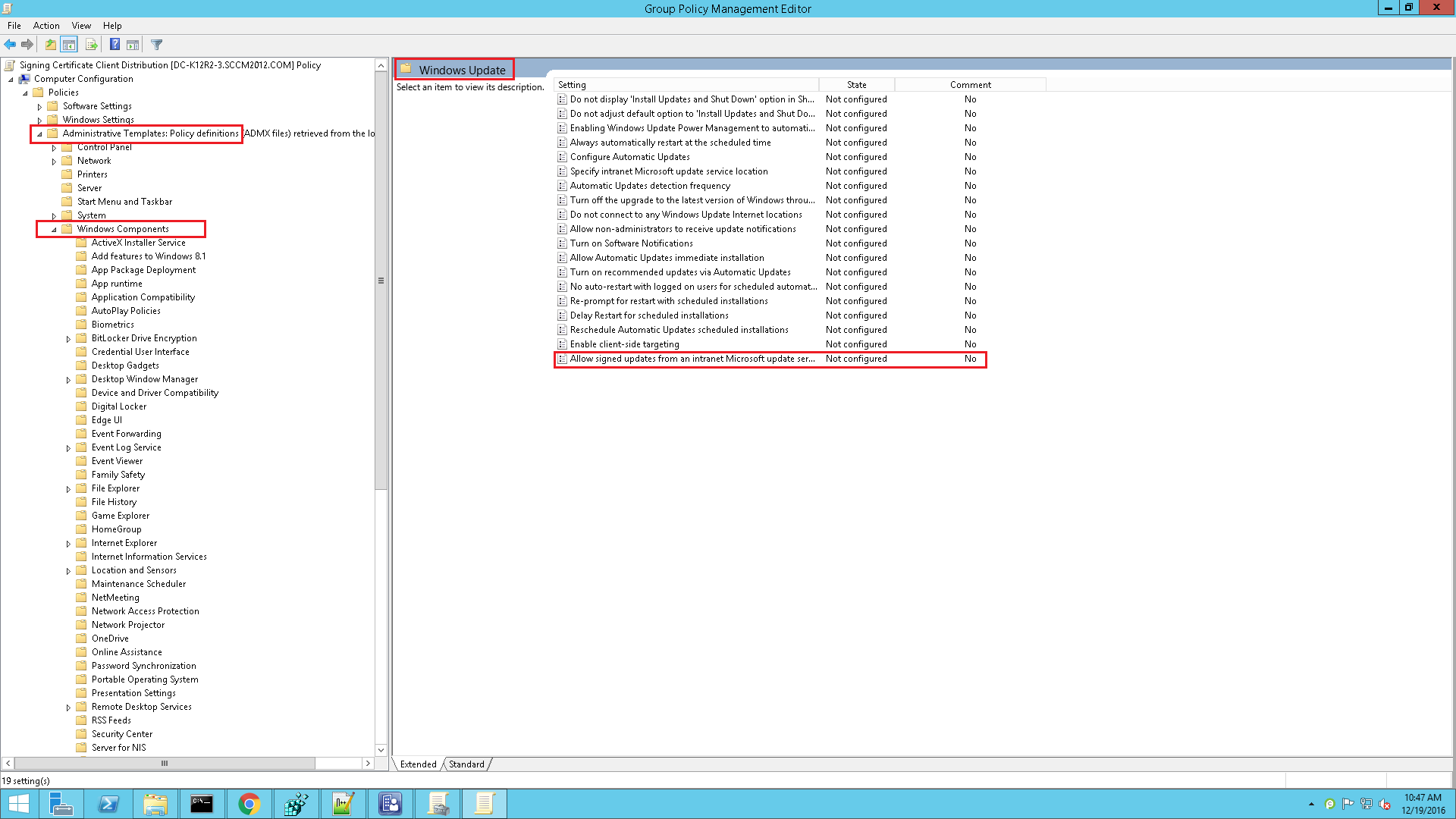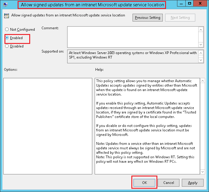 本文档将介绍使用GPO方法将签名证书部署到所有客户端计算机的步骤。必须将签名证书导入受信任的发布者和受信任的 根证书颁发机构 存储,才能信任第三方更新。允许来自Intranet的签名内容必须启用组策略管理中的Microsoft更新服务位置选项。这对于安装第三方补丁是必需的。