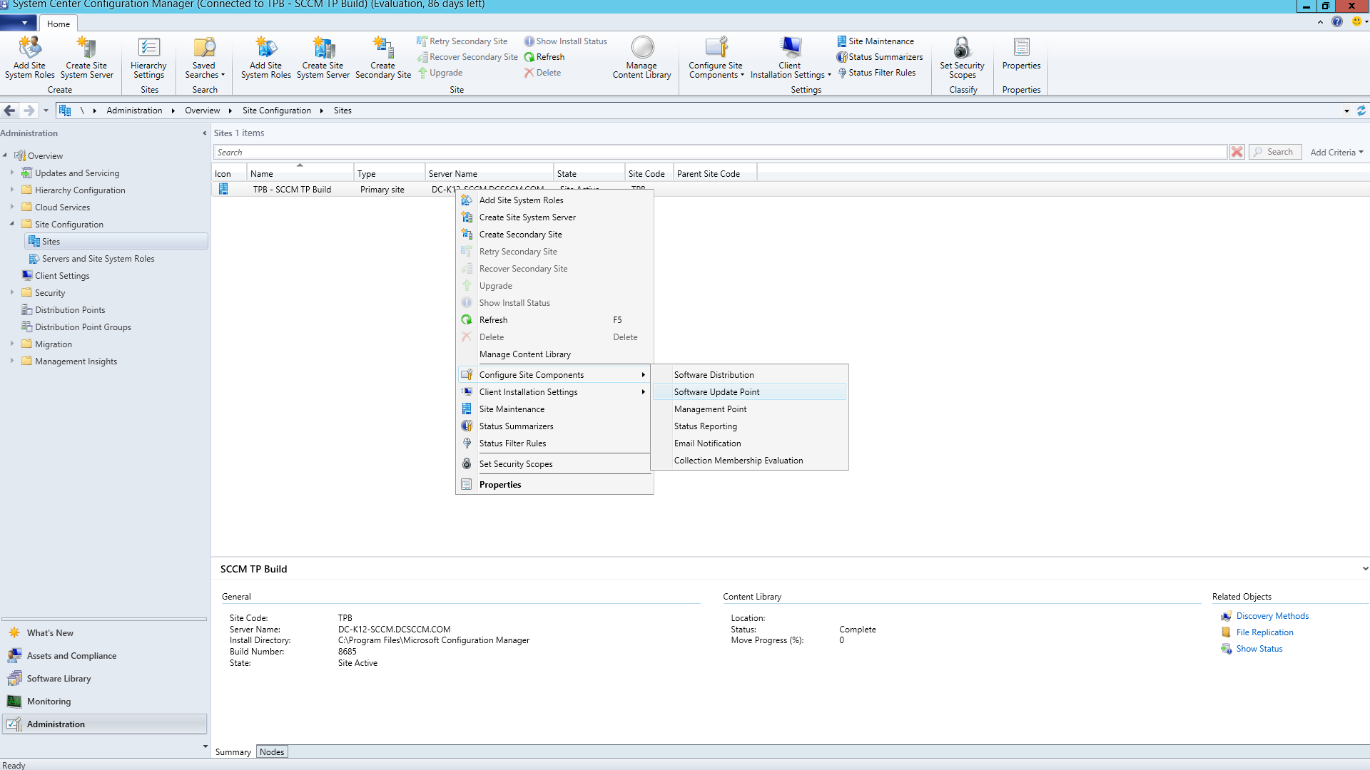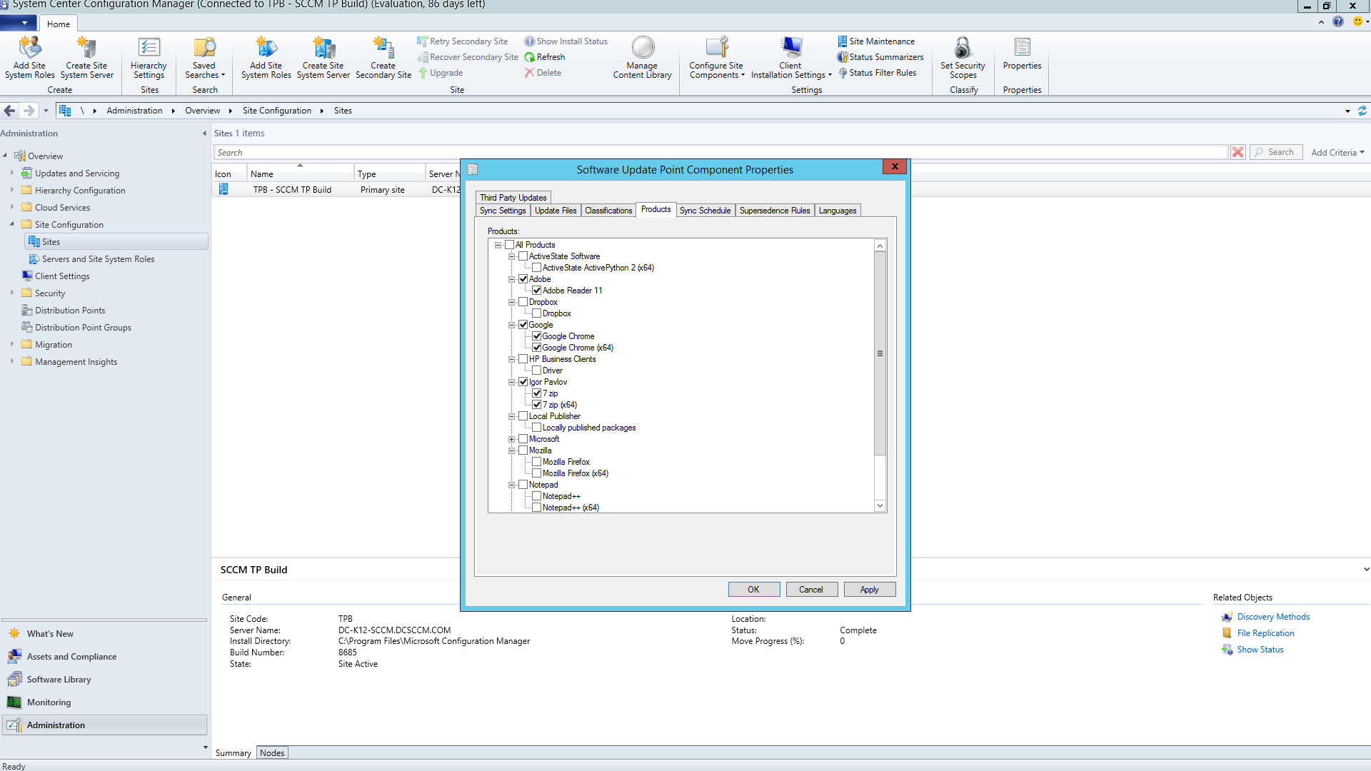 成功同步后,您需要从软件更新点中选择产品,以查看在SCCM中发布的更新。导航到\ Administration \ Overview \ Site Configuration \ Sites右键单击并选择Software Update Point