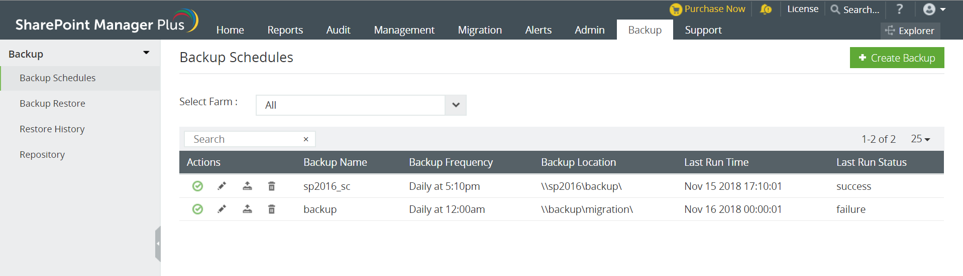 SharePoint Manager Plus允许管理员创建和管理备份计划。要添加、编辑或删除计划,请移至备份标签并从左侧面板中选择备份计划。已添加的计划列表(如果有)将出现在屏幕上。