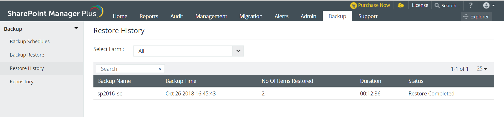 要查看已执行的备份恢复列表,请点击备份标签并点击左侧选项卡上的还原历史记录。选择要查看其还原历史记录的Farm后,将显示有关还原的各种详细信息,例如备份名称、备份时间、还原的项目数、持续时间和状态。