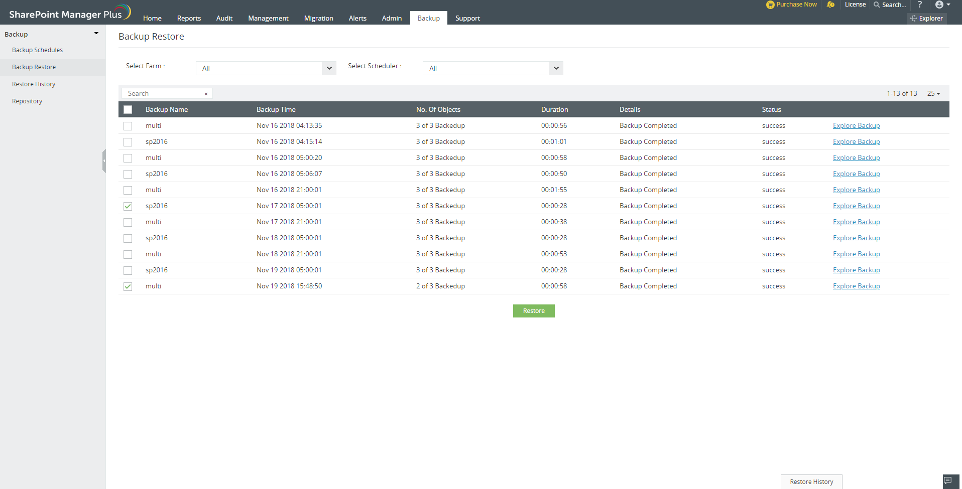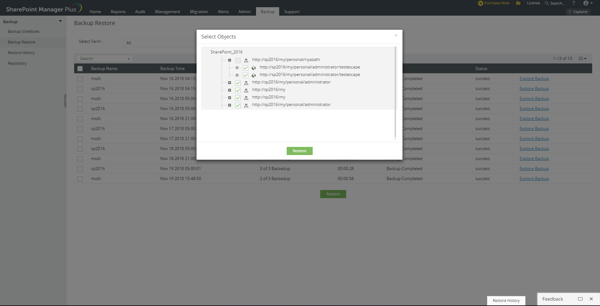 使用SharePoint Manager Plus,管理员可以备份SharePoint对象并在以后还原它们。