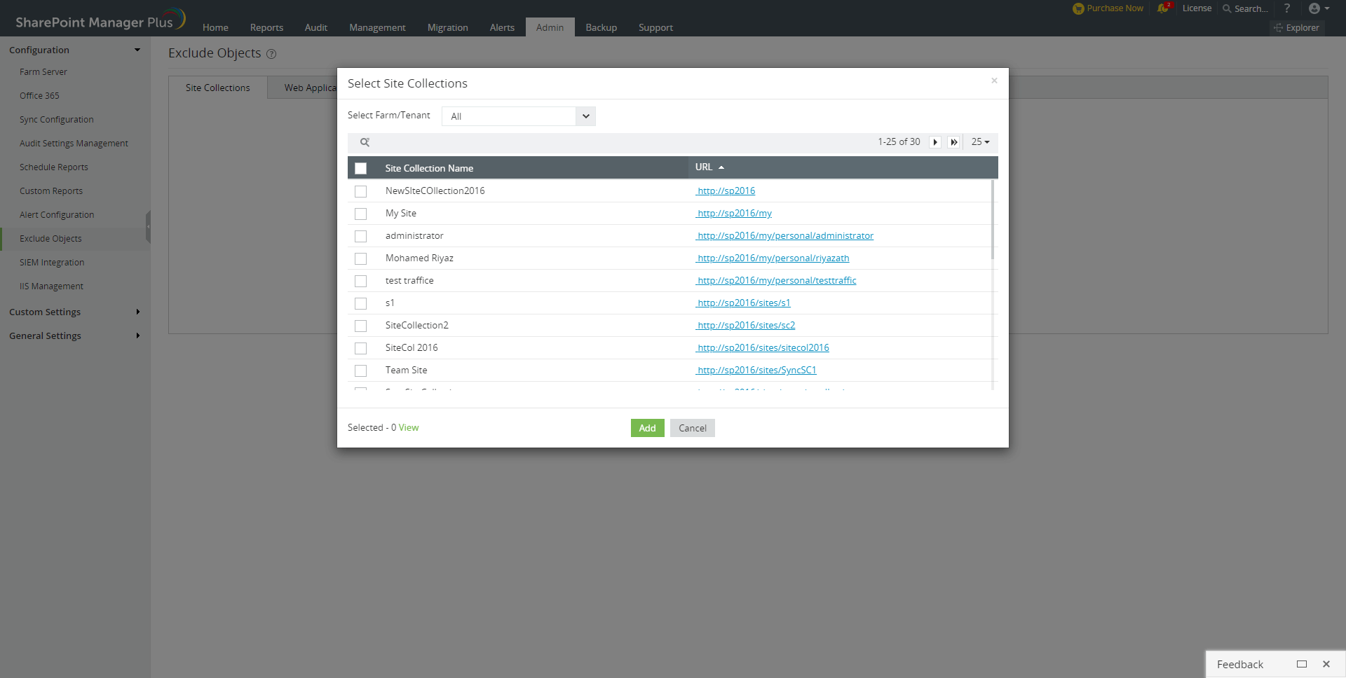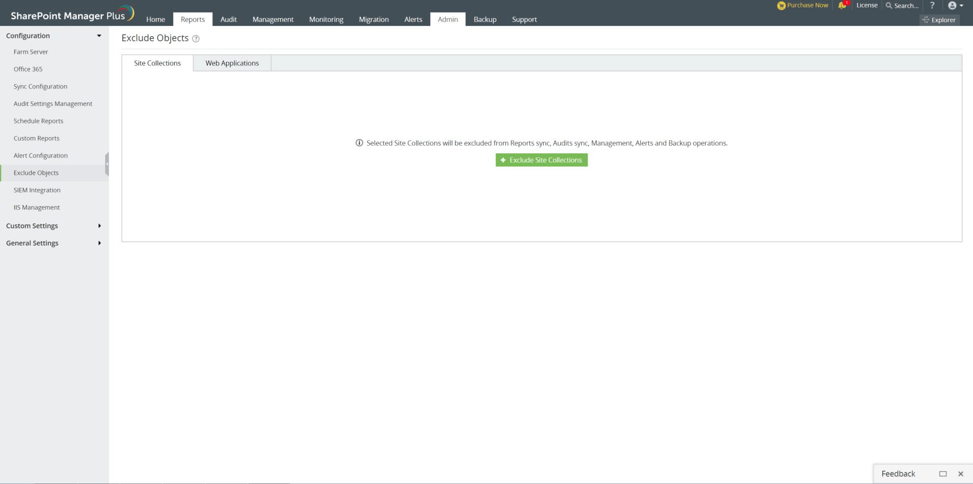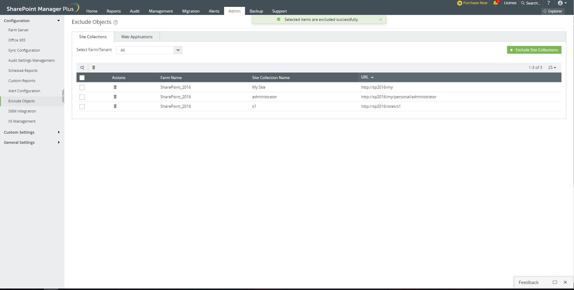 排除对象功能为用户提供了将某些站点或Web应用排除在同步其数据之外的选项。不会为排除的网站集和Web应用收集审核和报表数据。在管理、告警和备份标签中,不会对排除的站点执行任何操作。这可以帮助跟踪最重要的站点并提高可扩展性。