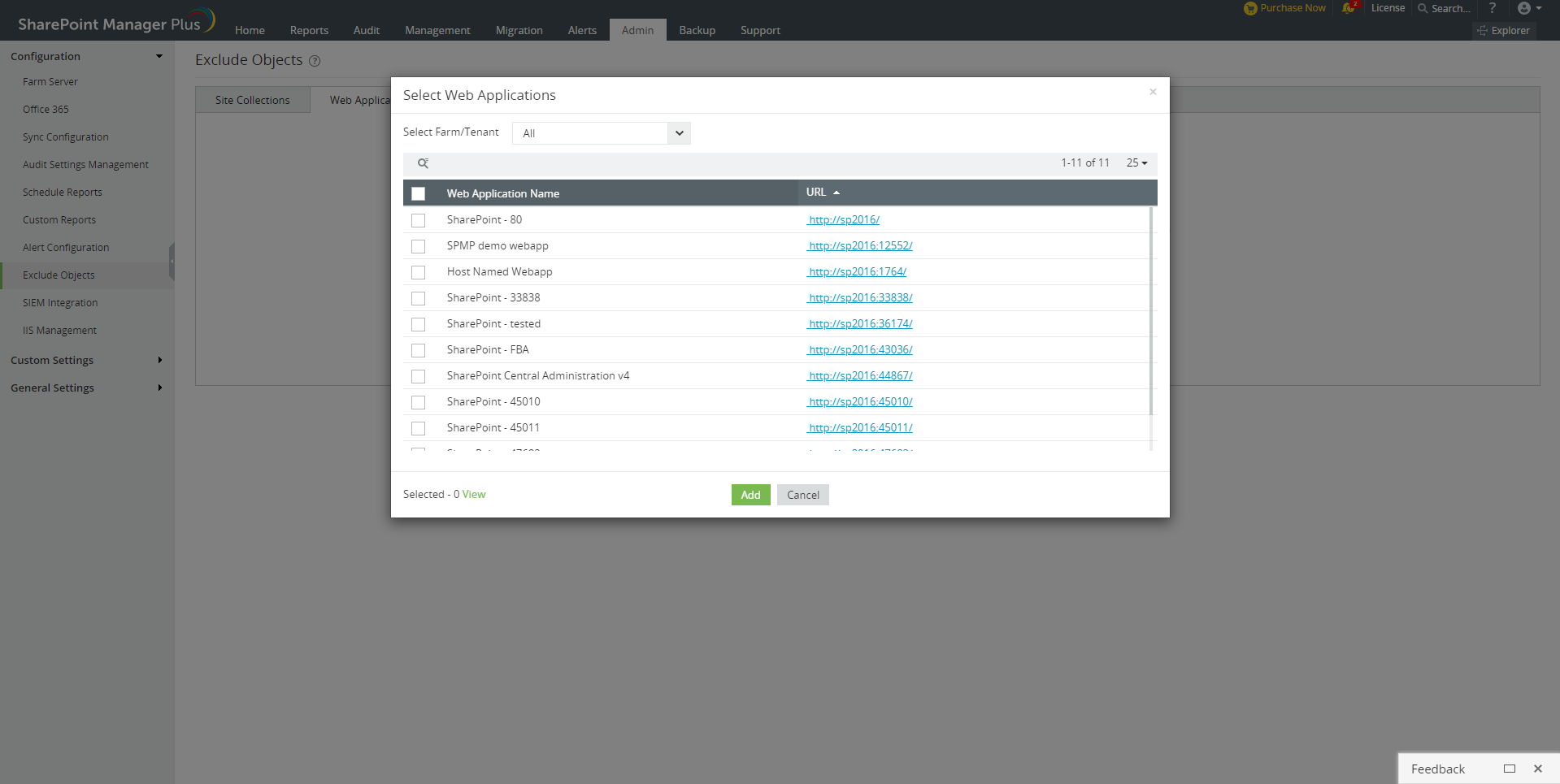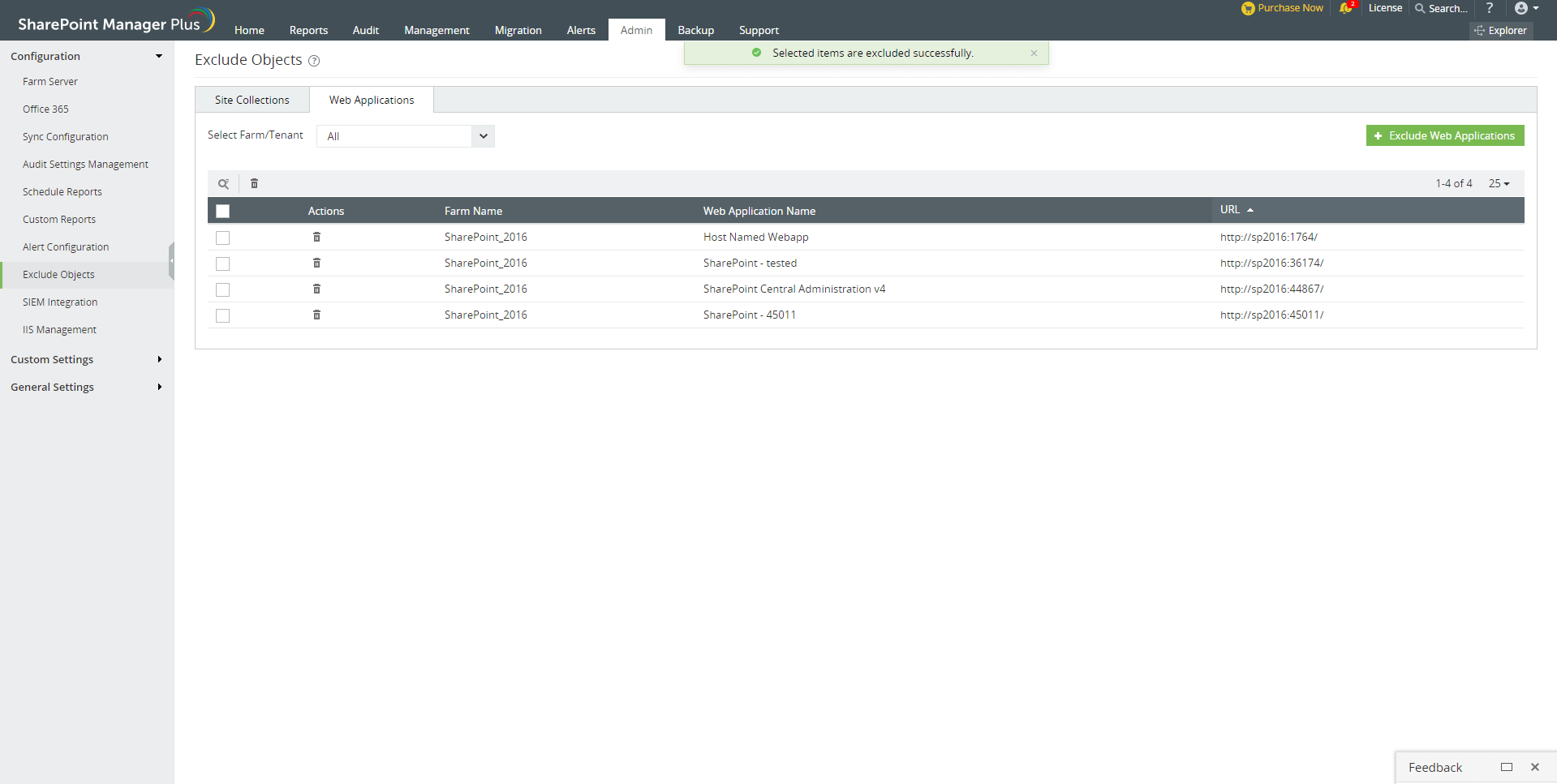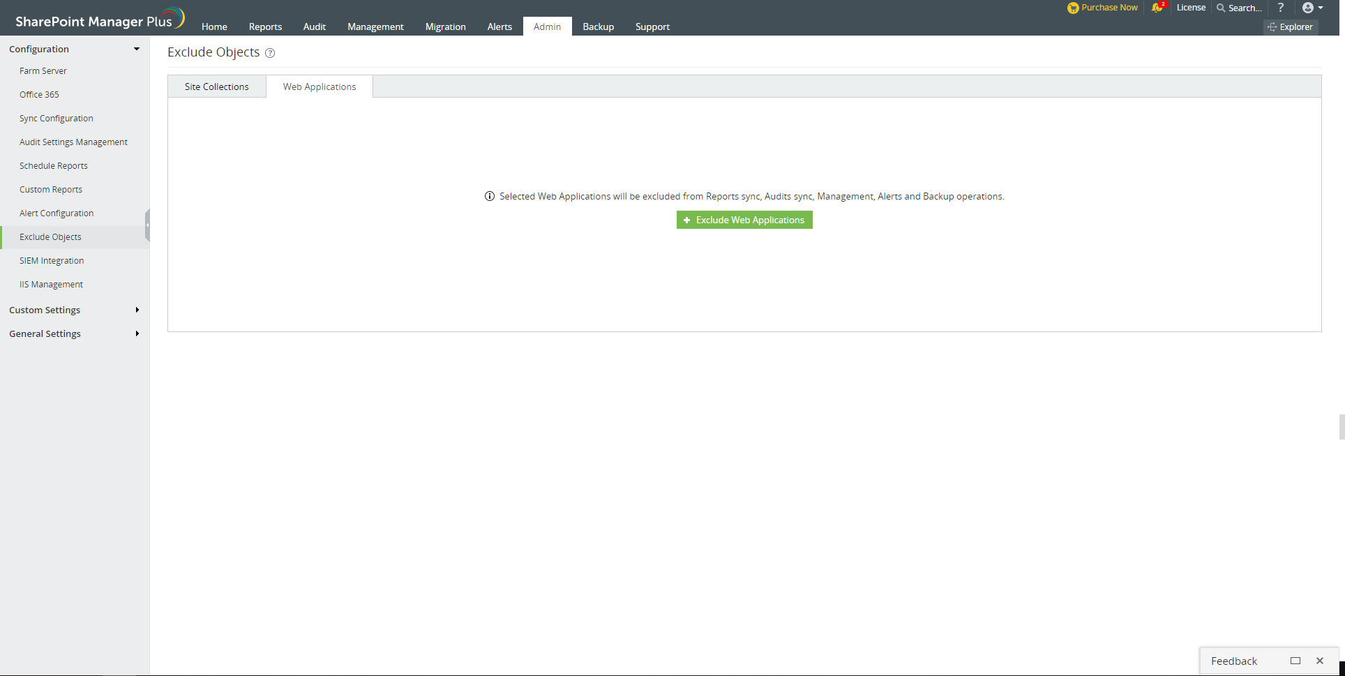 排除对象功能为用户提供了将某些站点或Web应用排除在同步其数据之外的选项。不会为排除的网站集和Web应用收集审核和报表数据。在管理、告警和备份标签中,不会对排除的站点执行任何操作。这可以帮助跟踪最重要的站点并提高可扩展性。