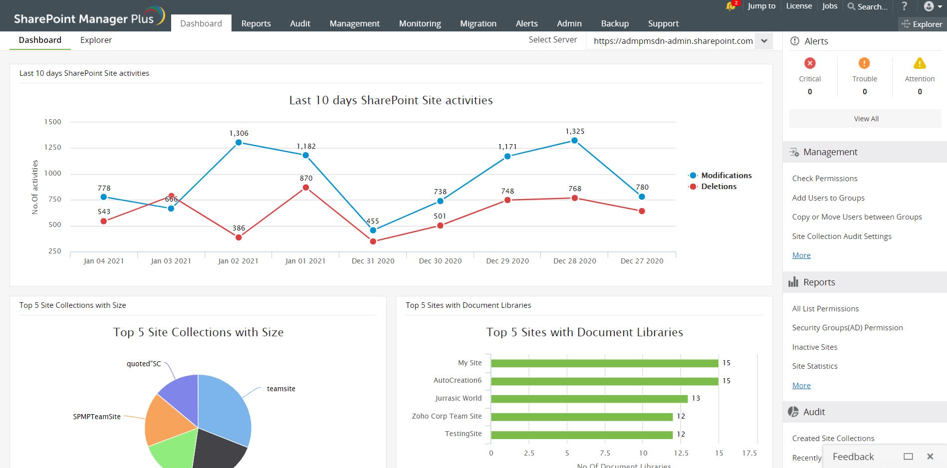 SharePoint Manager Plus主页标签组成了“仪表板”,它具有直观的窗口部件,可以提供有关SharePoint活动和存储模式的即时信息。