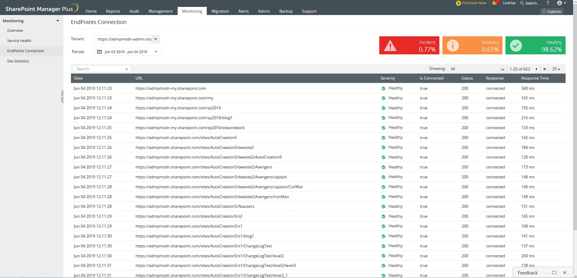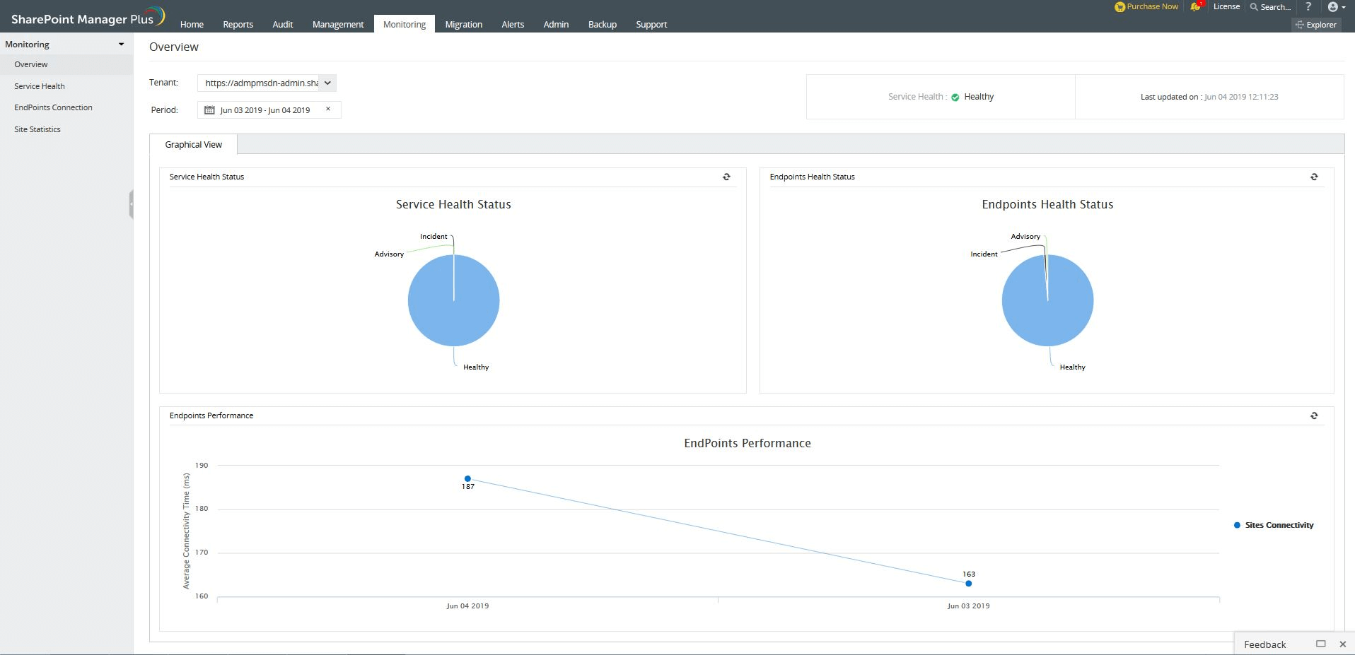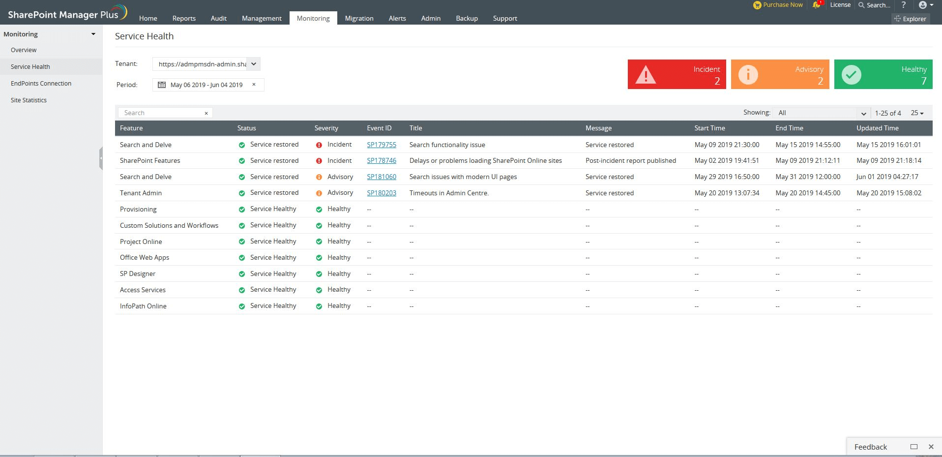 - 服务运行状况页面显示所选租户的所有SharePoint Online功能的运行状况。