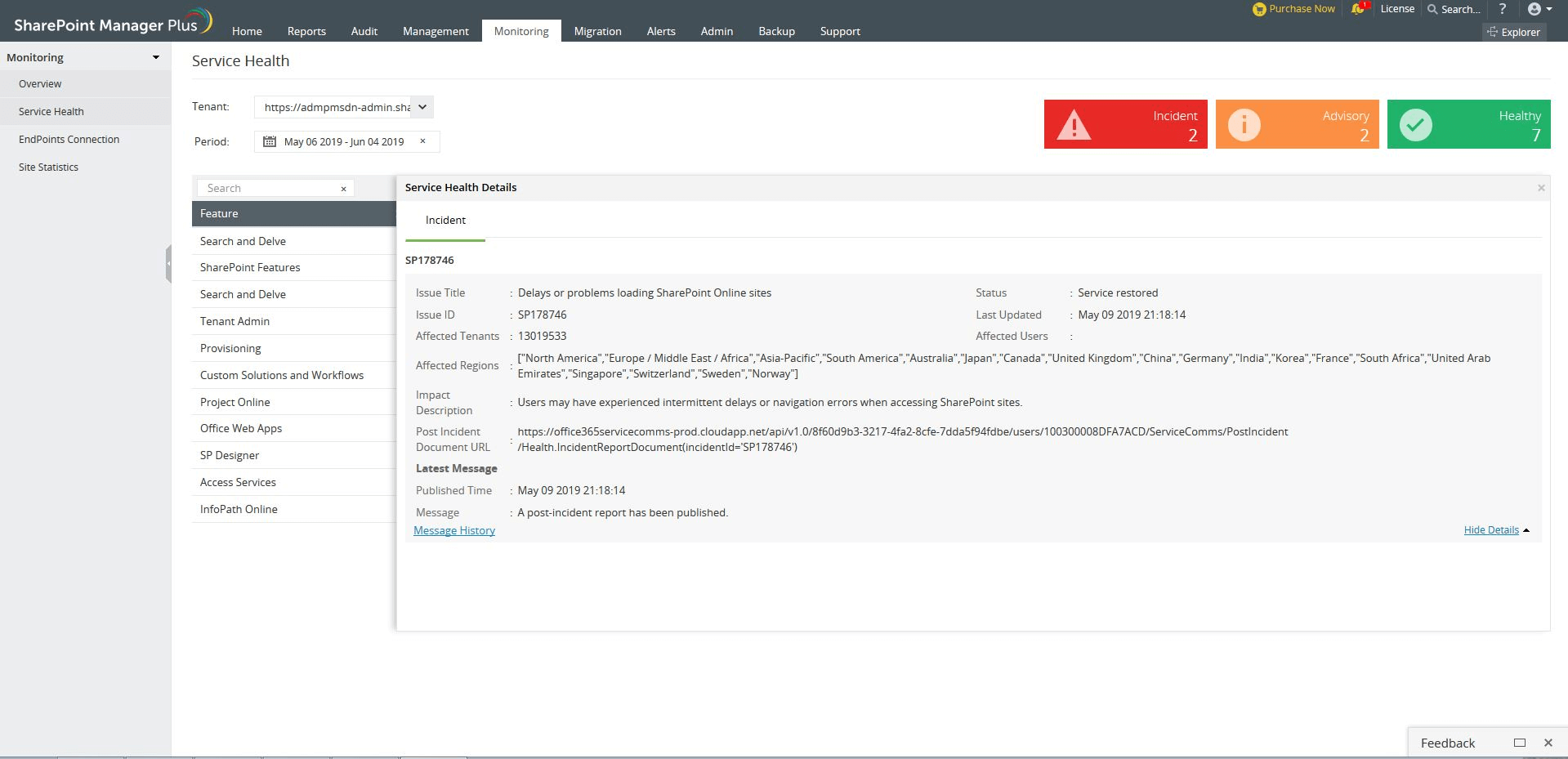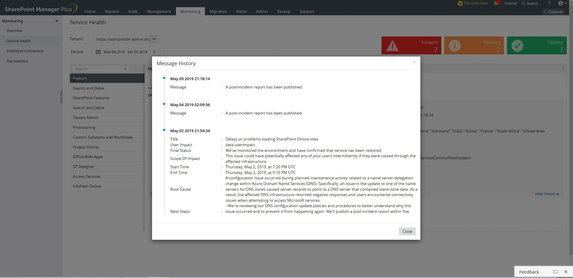 - 如果任何服务降级,可以在服务运行状况报表中看到影响、启动时间、根本原因和状态等详细信息。