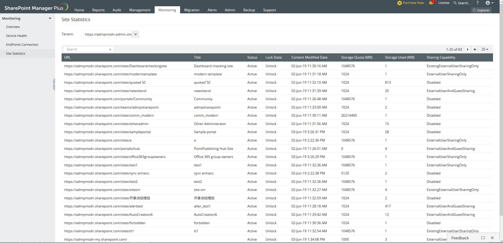 - 站点静态报表显示各种站点统计信息,例如存储配额、已用存储、共享能力、锁定状态和内容修改日期。