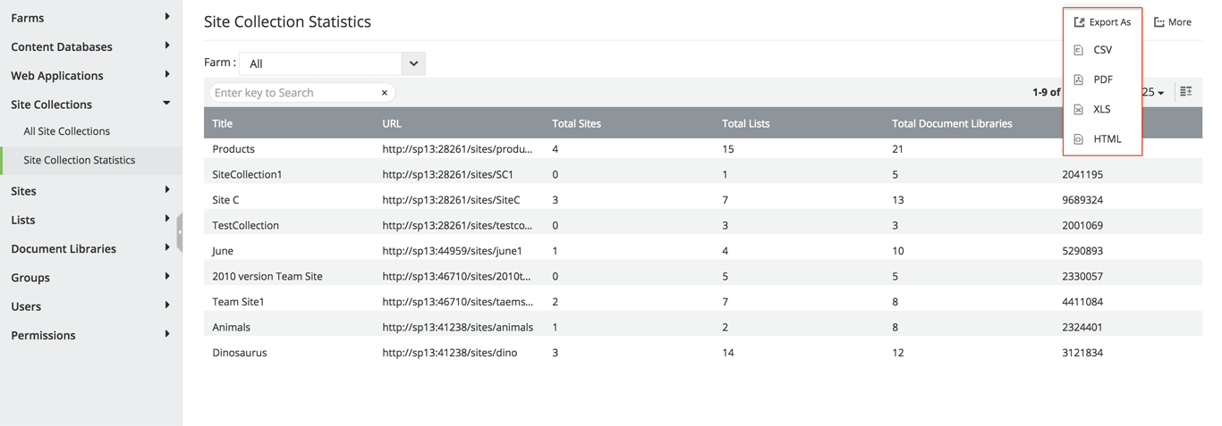 所有预定义的报表都可以以各种格式导出,如PDF、CSV、HTML和XLS。