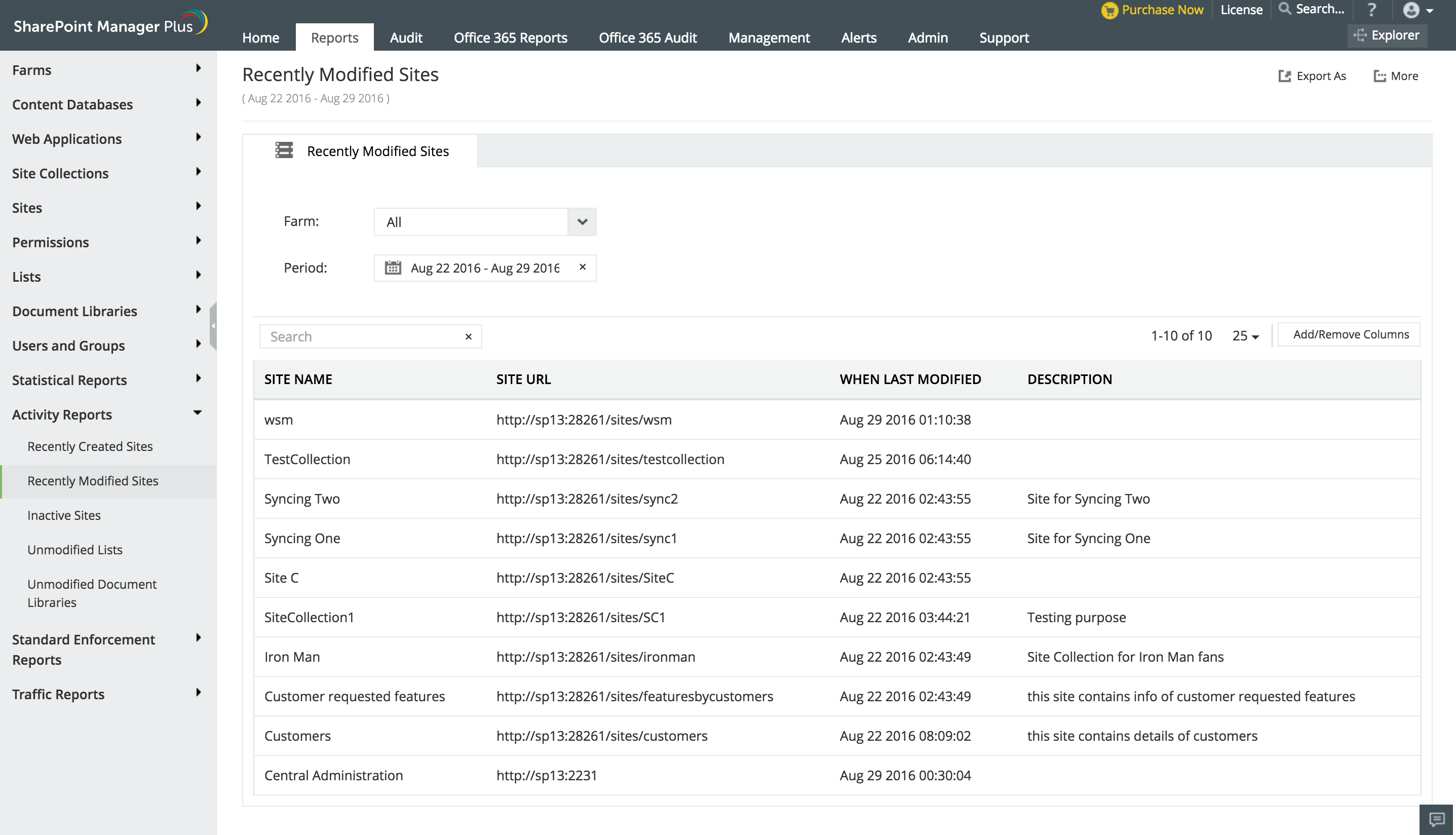 通过监控对象的创建和删除来监控您的SharePoint环境。但是,在监控对象之前,您需要先找到这些对象。SharePoint Manager Plus的报表将完成此繁重任务并为您标识这些对象。然后,您可根据这些报表中的信息决定最佳操作过程。