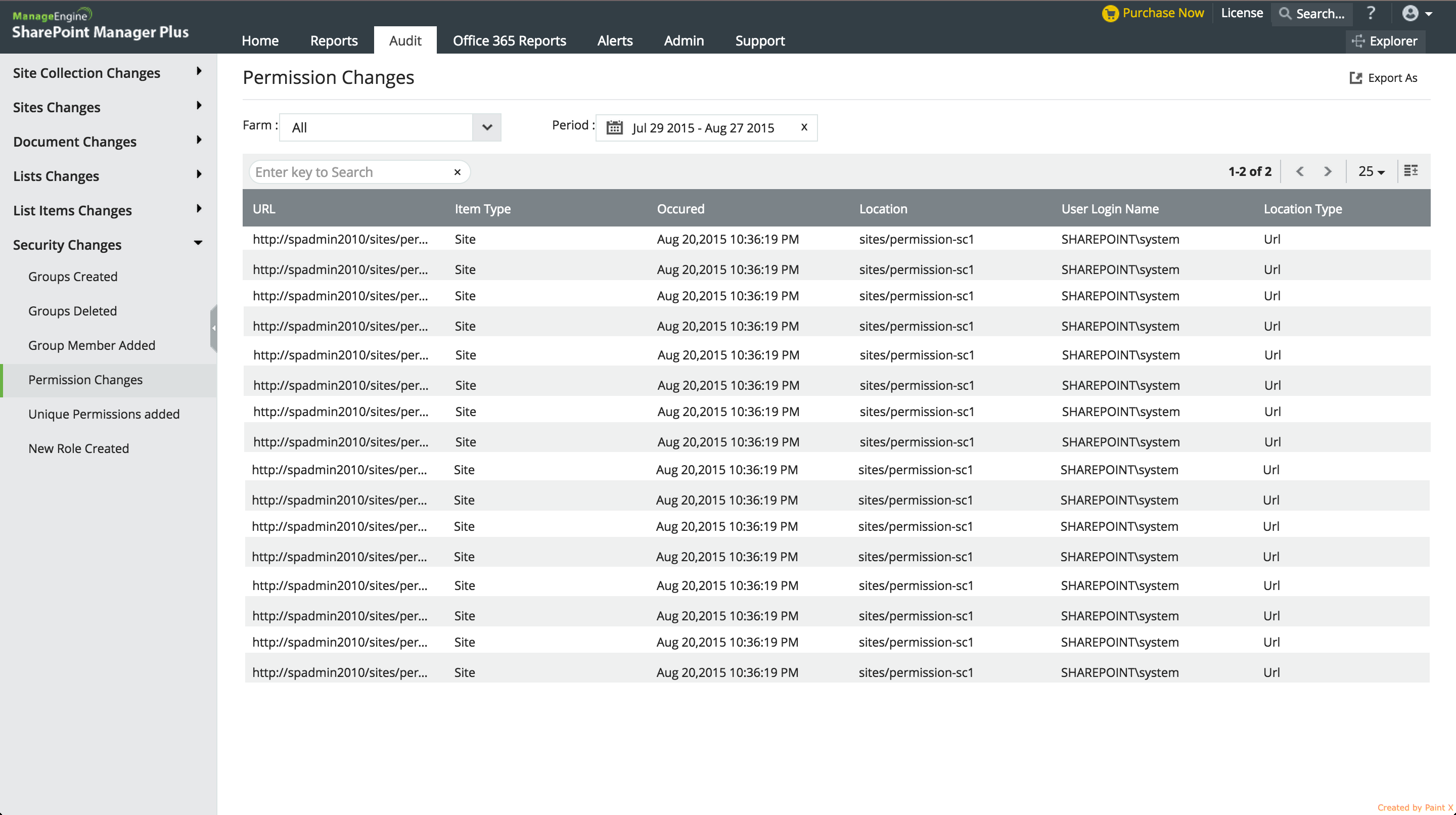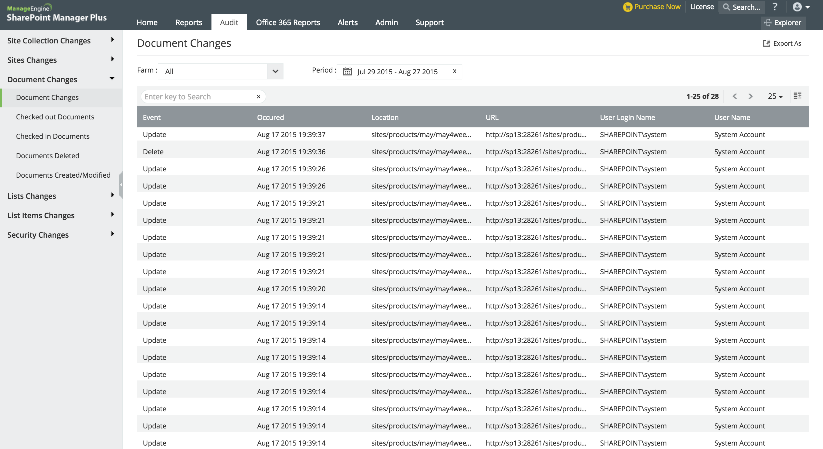 SharePoint Manager Plus允许您通过单一中央控制台轻松审核网络中部署的所有SharePoint服务器的站点集合、站点、文档和列表的更改。此解决方案提供即时现成审核报表,以给出有关以下各项的信息: