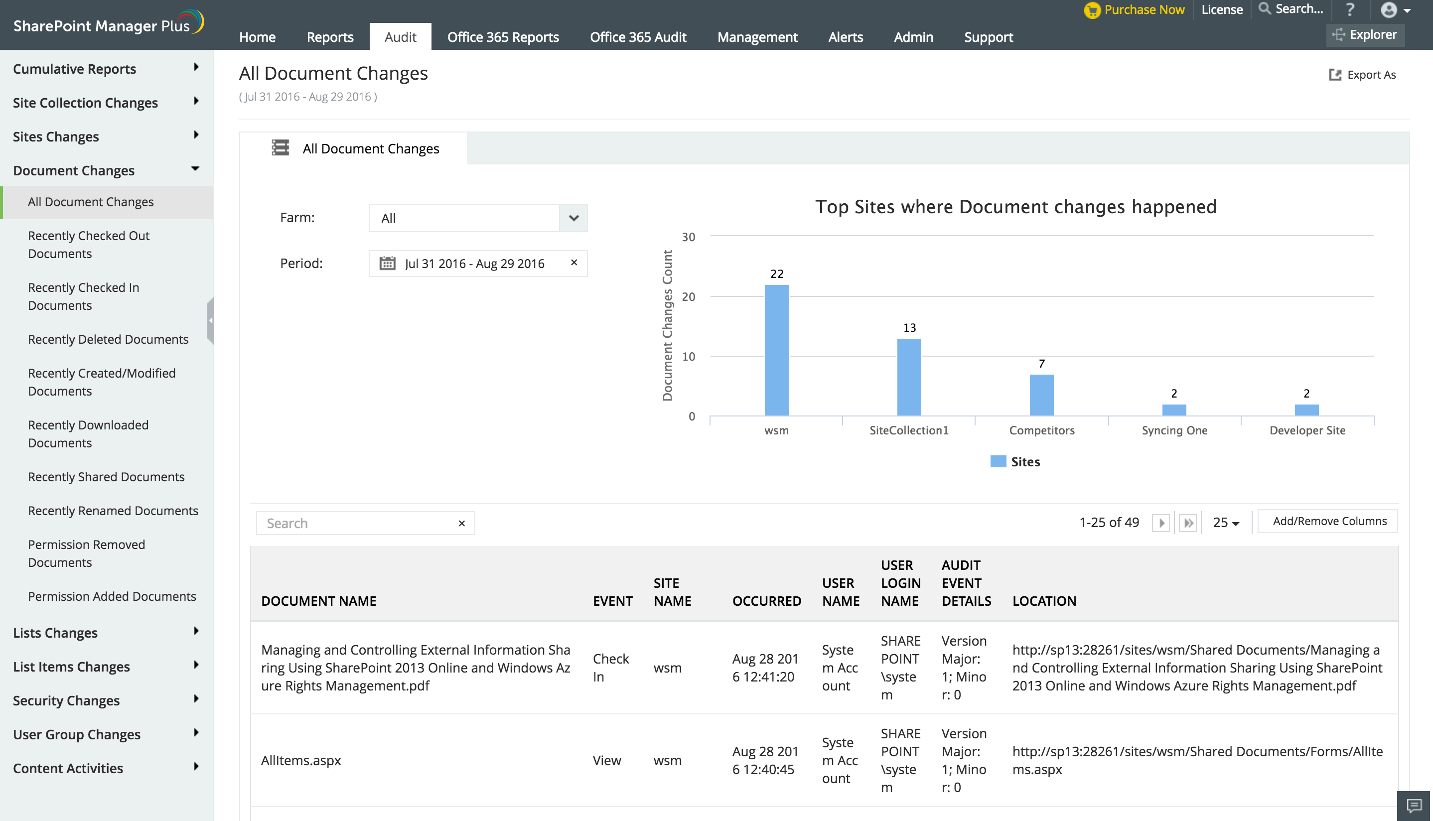 以事件审核日志的的形式查看SharePoint数据。您可对每个事件进行搜索、排序、过滤和分析,以确定事件发生位置、发生方式及导致事件发生的人员。此外,还有一些综合图形会提供每个事件的摘要。