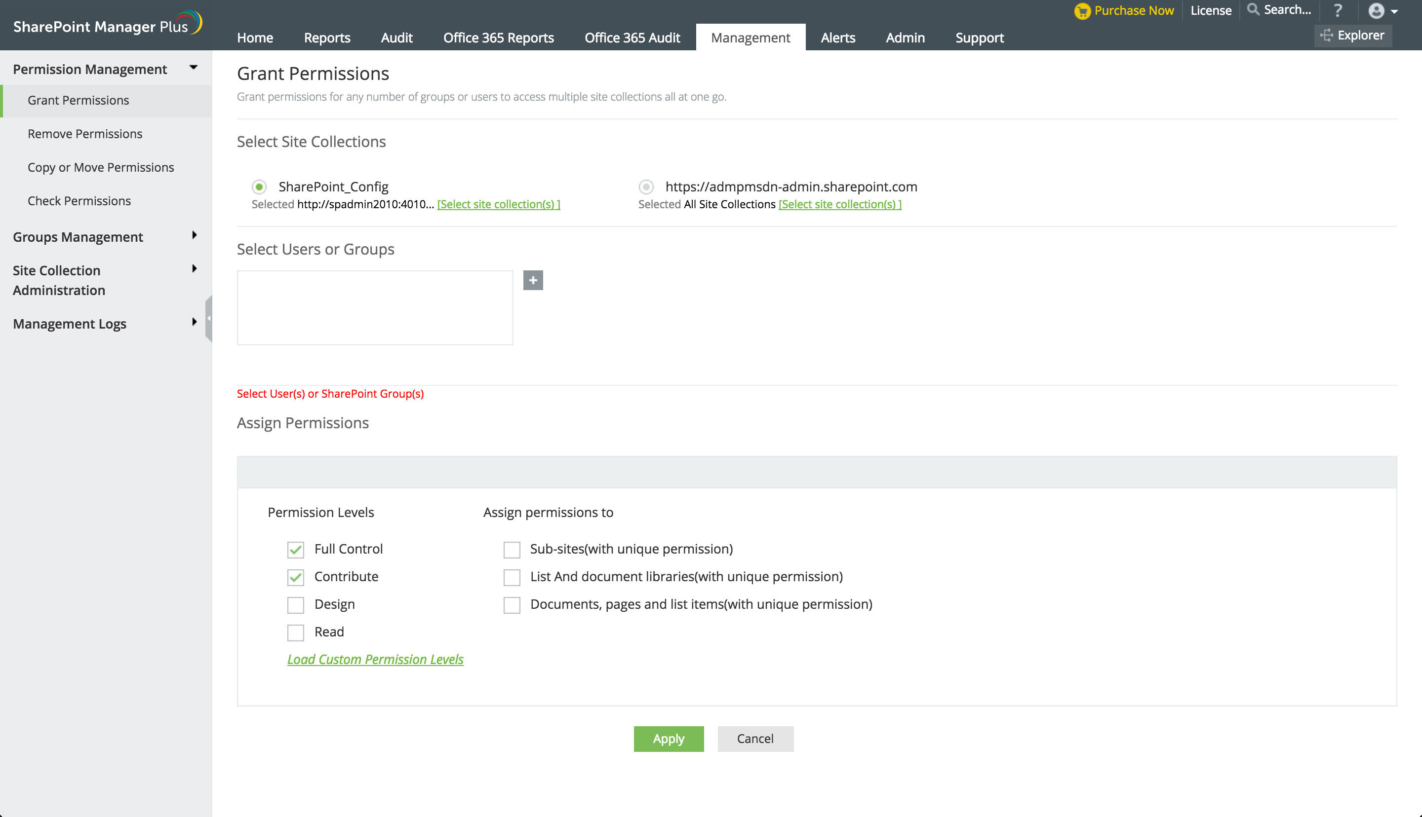 SharePoint Manager Plus允许您点击一下就可对定向或批量站点集合添加、移除或复制权限,从而简化了权限管理的过程。它还提供了其他选项,例如,对子站点和站点集合应用权限,以及让您针对站点集合检查用户权限。