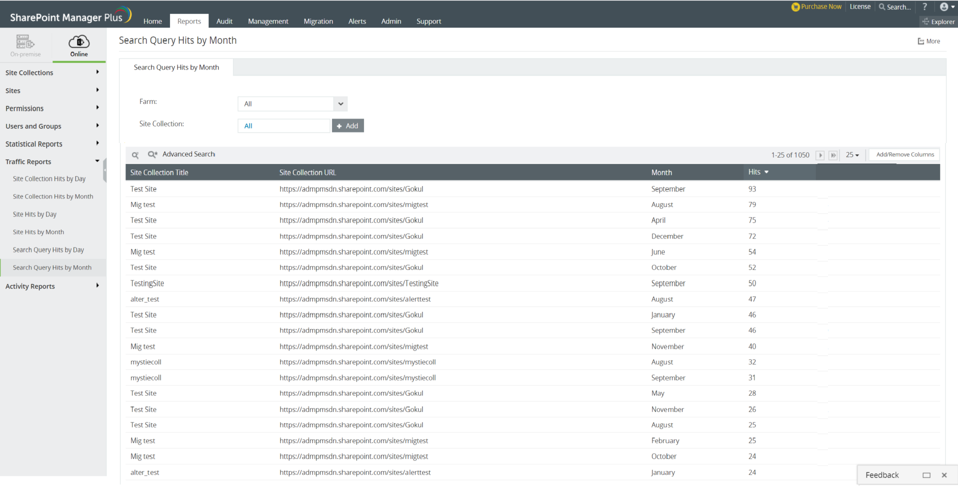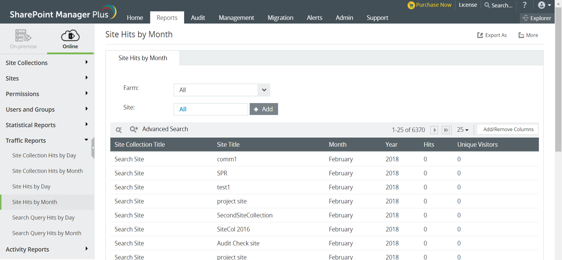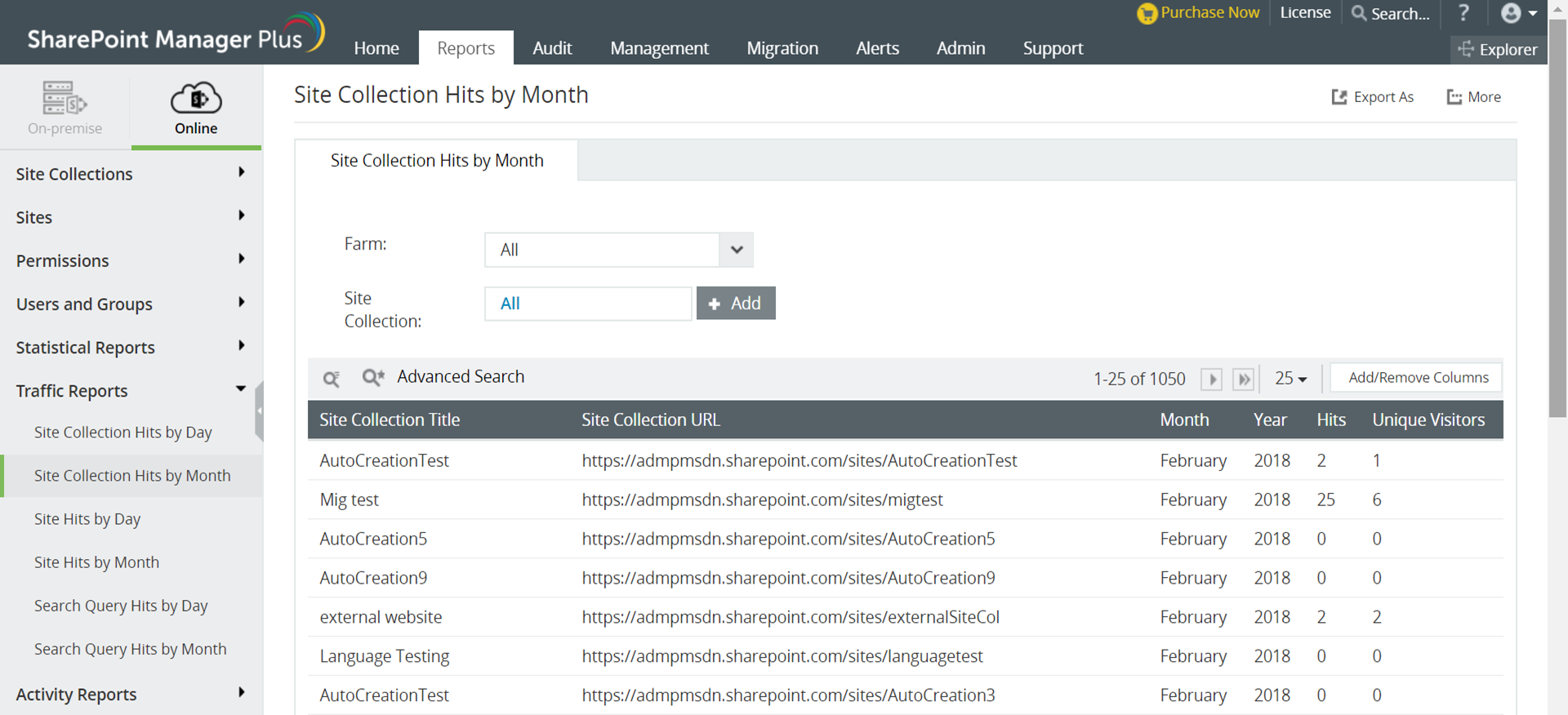 无论您需要收集有关用户的SharePoint Online活动的常规统计信息,还是只想了解哪些内容最受欢迎, SharePoint Manager Plus的使用情况报表都会提供您需要的信息。想要有关每个SharePoint站点的点击量的详细信息吗?流量统计信息中的“每月站点集合”报表可能会有所帮助。