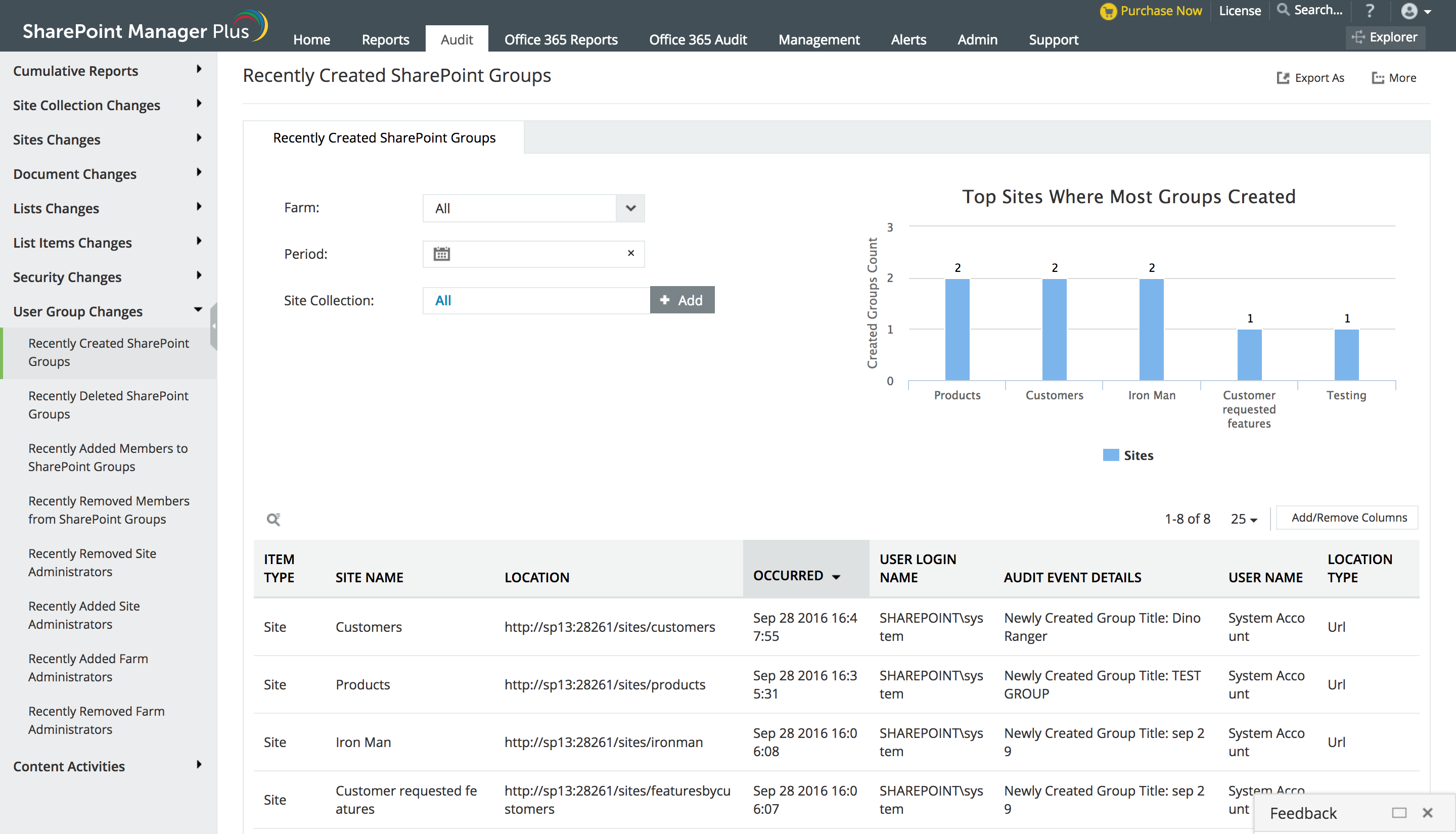SharePoint Manager Plus通过针对SharePoint用户和组的专属 报表 来完成此任务。这些报表非常准确、易于阅读,可被安排并通过电子邮件以PDF、HTML、XLS或CSV格式分发。
