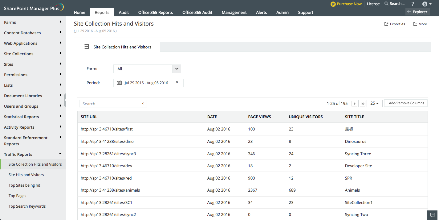 SharePoint Manager Plus通过有关流量和搜索的详细报表来提供有关用户行为的深入分析。此信息可帮助您评估工作效率级别,从而设置改进目标。
